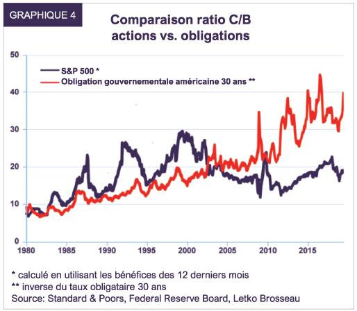 Le degré de surévaluation intégré aux obligations longues peut se mesurer d’après leur « ratio cours/bénéfice » (C/B). Plus le ratio du prix de l’obligation (cours) à ses versements d’intérêts annuels (bénéfice) est élevé, plus l’obligation est chère. Le ratio C/B de l’obligation du gouvernement américain à 30 ans est de 40 (graphique 4). Parallèlement, celui d’une obligation du gouvernement du Canada à long terme se transige à 59 fois.