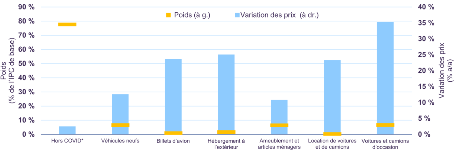De même, les principaux vecteurs de l’inflation de base se concentrent dans une poignée de biens et services fortement faussés par la pandémie. En excluant les voitures et camions neufs et d’occasion, la location de voitures et de camions, les billets d’avion, l’hébergement et l’ameublement, l’inflation de base se situerait autour de 2,5 % aux États-Unis. Or, en incluant ces éléments, l’inflation de base est 6 % – signe de l’énorme influence d’un groupe de biens et services qui ne représentent que 22 % du panier de l’IPC de base (Graphique 3).
