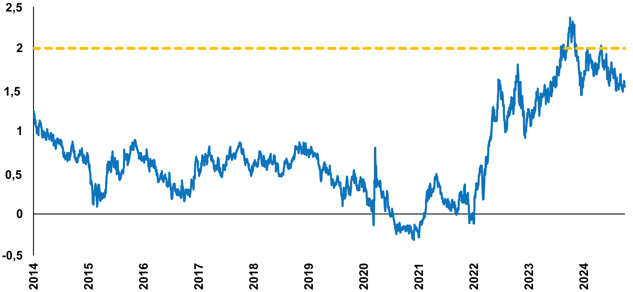 L’inflation de base se rapproche du niveau cible de 2 % et les pressions salariales ne sont plus susceptibles de limiter l’ampleur des nouvelles baisses de taux de la BCE. Même si l’activité économique de la zone euro devrait rester faible par rapport aux normes historiques, le risque d’un scénario défavorable s’éloigne.
